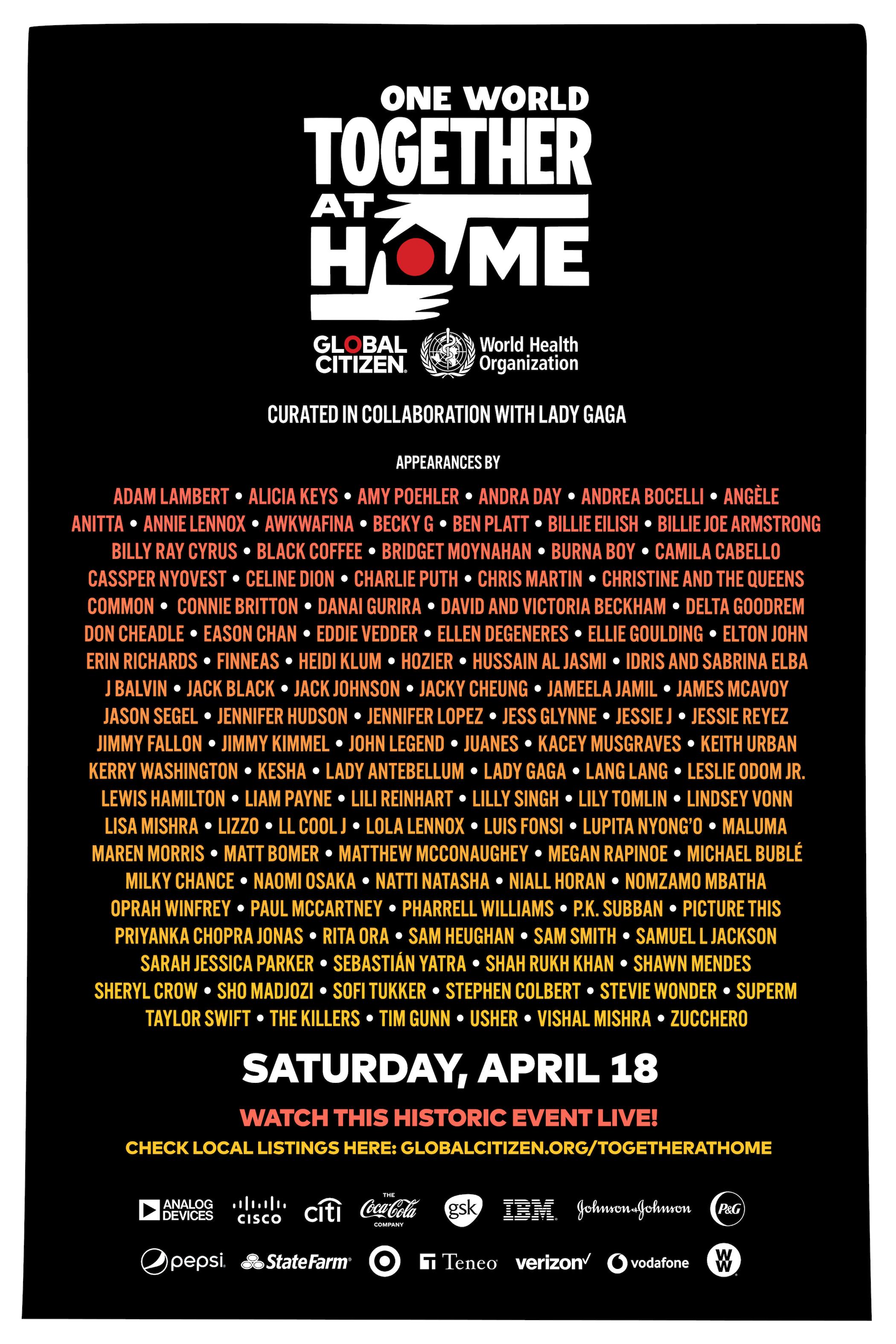 A broadcast of a global special organized by Global Citizen and the World Health Organization featuring comedians, musicians, and actors to raise funds in support of front line health workers in the global response to COVID-19.